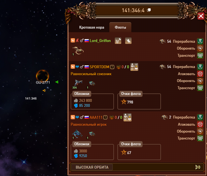 Однако, в окне контроля флотов, у меня осталась видимость летящего на эти координаты грузовика другого игрока, видимо для заправки зависшего флота (скрин №1 и 2). Но видеть полёт чужого флота я не должен, т.к. моих юнитов на координатах червоточины не осталось! Союзников и друзей, которые могли бы расшарить летящий флот, не было.