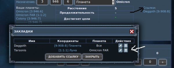 Переделаны закладки с координатами (ссылки) в космопорте, теперь все операции с ними не требуют перезагрузки страницы. Так же добавлена возможность отображения ссылки только для текущей планеты.