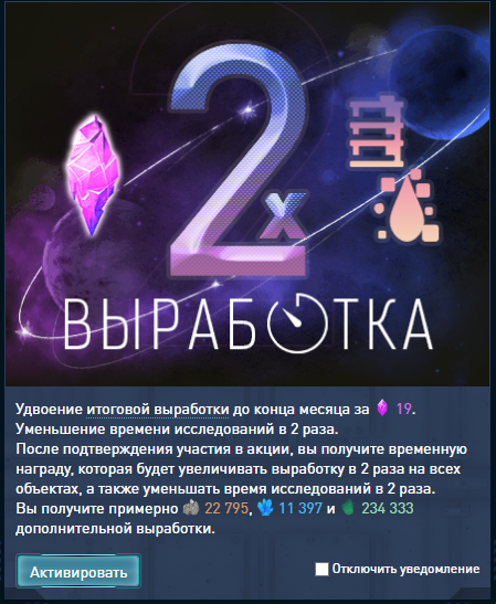 После подтверждения участия в акции, вы получите временную награду, которая будет увеличивать выработку в 2 раза на всех объектах, а также уменьшать время исследований в 2 раза.Вы получите примерно 36 457, 18 228 и 730 059 дополнительной выработки.