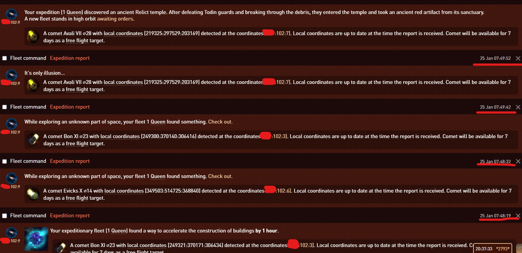 Перед тем, как возникла проблема, один из моих экспедиционных флотов совершил много экспедиций за десять минут, а не по крайней мере один раз в час. Подскажите пожалуйста