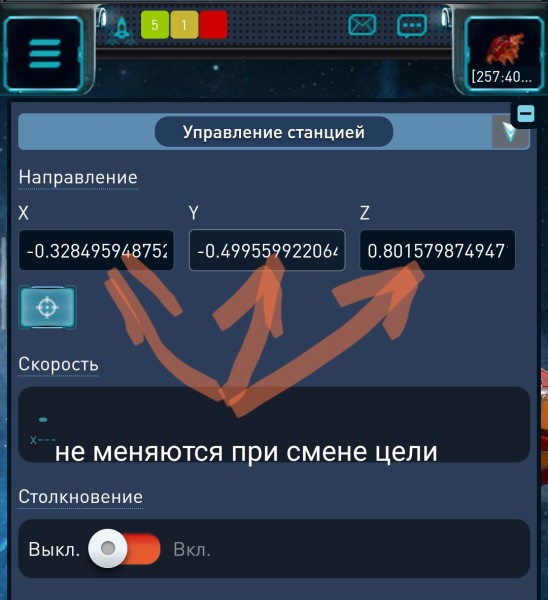На ОПС не удаётся навести гравипушку на цель. При смене координат цели, значения в полях "направление" не изменяются. Управление в общоре тоже не работает.