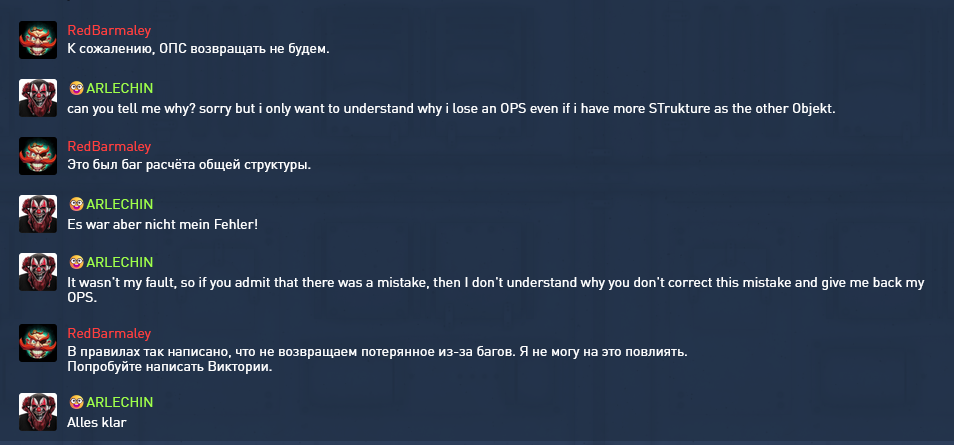Der Thread im Fehlerforum ist nicht nur dazu da, Fehler an die Administration zu melden. Es ist dazu gedacht, technische Probleme zu lösen, die im Spiel auftreten. Bevor Sie ein Thema erstellen, sollten Sie prüfen, ob es bereits ein Thema mit dem Fehler gibt, den Sie melden möchten. Um Fehler oder Glitches zu melden, können Sie ein neues Thema erstellen, anstatt in die bestehenden Themen zu schreiben. Themen mit dem Titel Fehler, Glitch werden nicht berücksichtigt. Versuchen Sie, eine kurze Beschreibung Ihres Problems in den Titel des Themas zu schreiben.Wenn das beschriebene Problem auf einem anderen Konto aufgetreten ist, geben Sie unbedingt das Konto an, auf dem es aufgetreten ist.