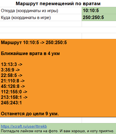 Помощник выведет маршрут полёта по вратам. Определит ближайшие, построит маршрут по вратам, определит сколько останется лететь до цели с последних врат. Сервис работает на гугл-таблицах, данные по вратам заносятся на отдельном листе. Алгоритм построен исходя из минимального количества прыжков между вратами.