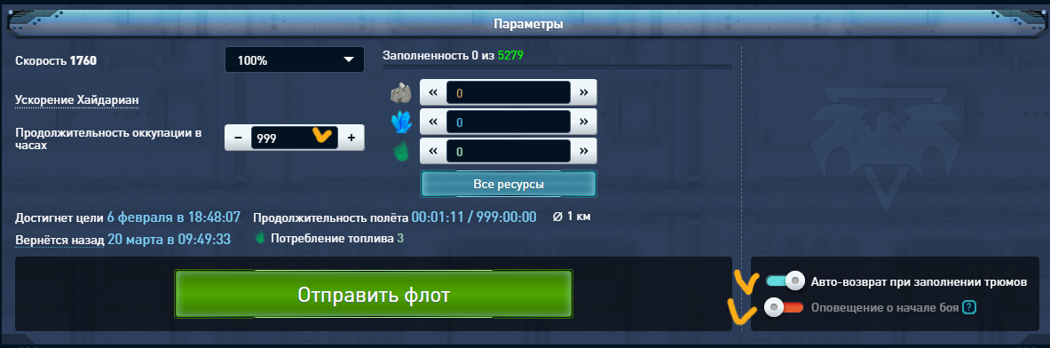 - Если функция активна (замок закрыт), то значение сохраняется и выставляется по умолчанию в следующий раз во время отправки флота с этим же приказом.