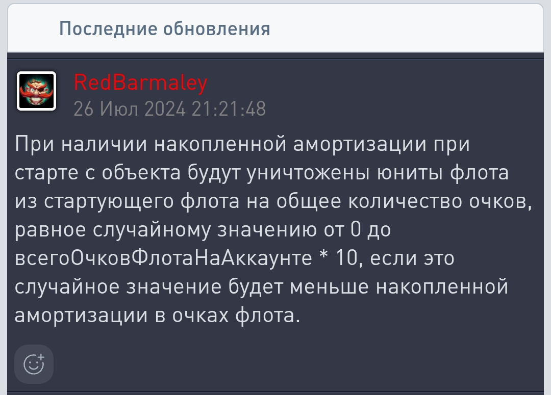 Анонс такого встречали вообще или что-нибудь о таком слышали? ... "Ваш флот (или его часть) (*), отправленный на (*) с приказом «Переработка», уничтожен из-за накопленной амортизации. Накопленная амортизация уменьшена на (*) единиц газа веспен."
