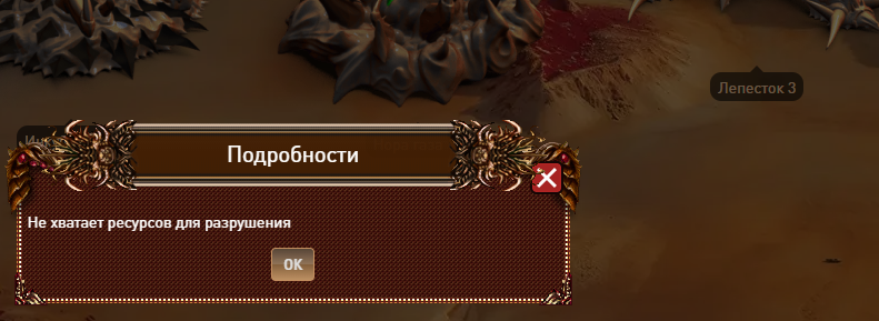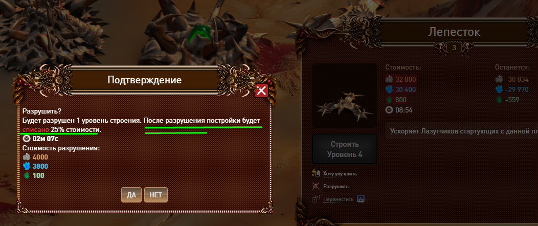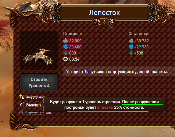 Описание: При попытке разрушить постройку идет попытка списывания ресов на разрушение в начале процесса хотя в описании написано совсем наоборот. И если на планете нет ресурсов разрушение не происходит.