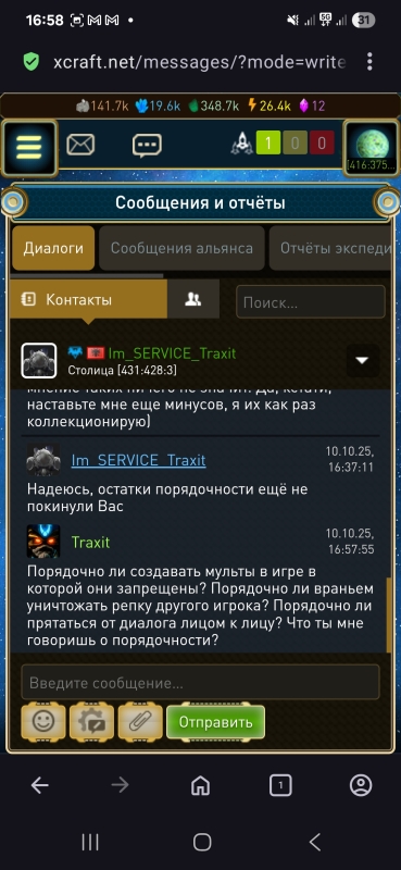 https://xcraft.net/battle/index.php?battle_id=00d3ecc469e5e3c850ba97f988100e2d враки всё. Он в колонизации висел. А это сейф реса. Ну вот сами подумайте, было бы у меня на планке 10кк реса и только сервис, вас бы это остановило?)